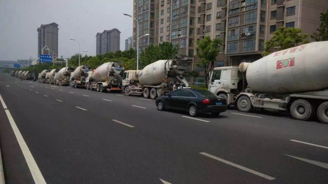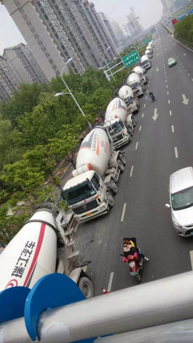 合肥綠地中心位于高鐵路與廬州大道交口,項目定位為55萬方安徽首席高鐵綜合體,產(chǎn)品由一棟200多米超高層,三棟國際甲級辦公樓,4棟城市精英中央官邸和LOHAS商業(yè)綜合體組成。 該項目主樓筏板為C45P8砼,核心筒處深度達8.9m,砼體量為12000m3。主樓高220m,1-22層墻柱為C60砼,22層以上墻柱為C50砼。 下圖為澆筑該項目主樓12000m3大體積同時現(xiàn)場等待的砼攪拌車。